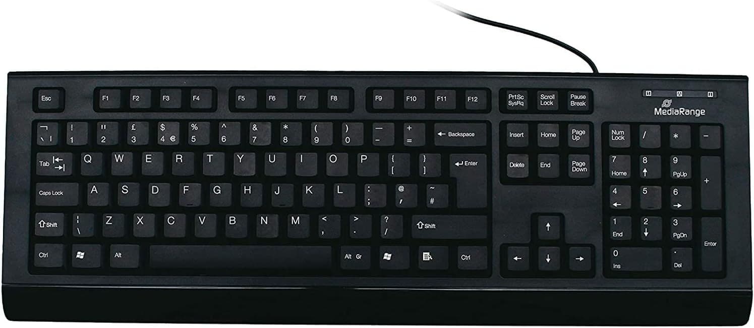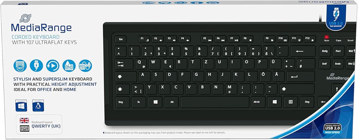 MediaRange Wired Keyboard, QWERTY (UK) T1, Full-Size with Numeric Keypad & Function Keys, Ultra-Flat Keys, 1.5m Cable, Black